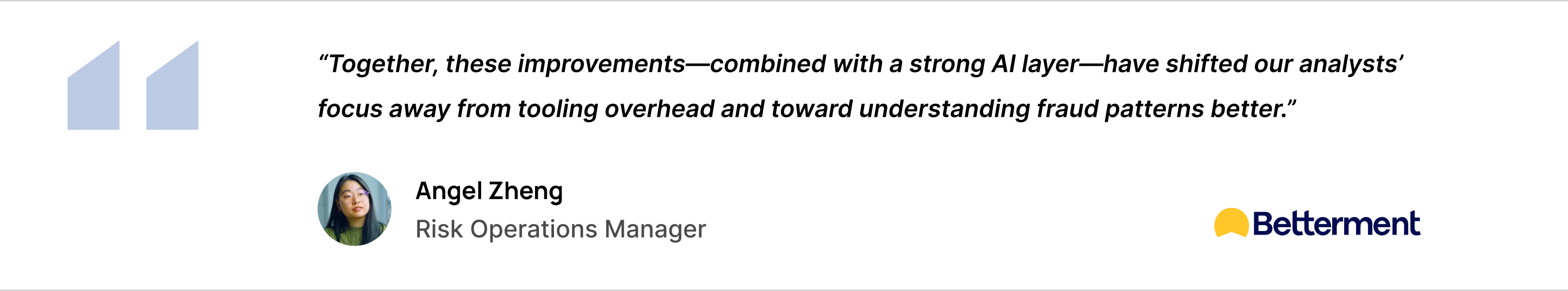 With unified case management, configurable risk scoring, and AI-driven intelligence in place, Betterment has fundamentally reshaped how its analysts spend their time. Work that once required manual coordination across multiple systems now runs inside a single operating environment, giving the team clearer visibility and more consistent workflows across the fraud program.