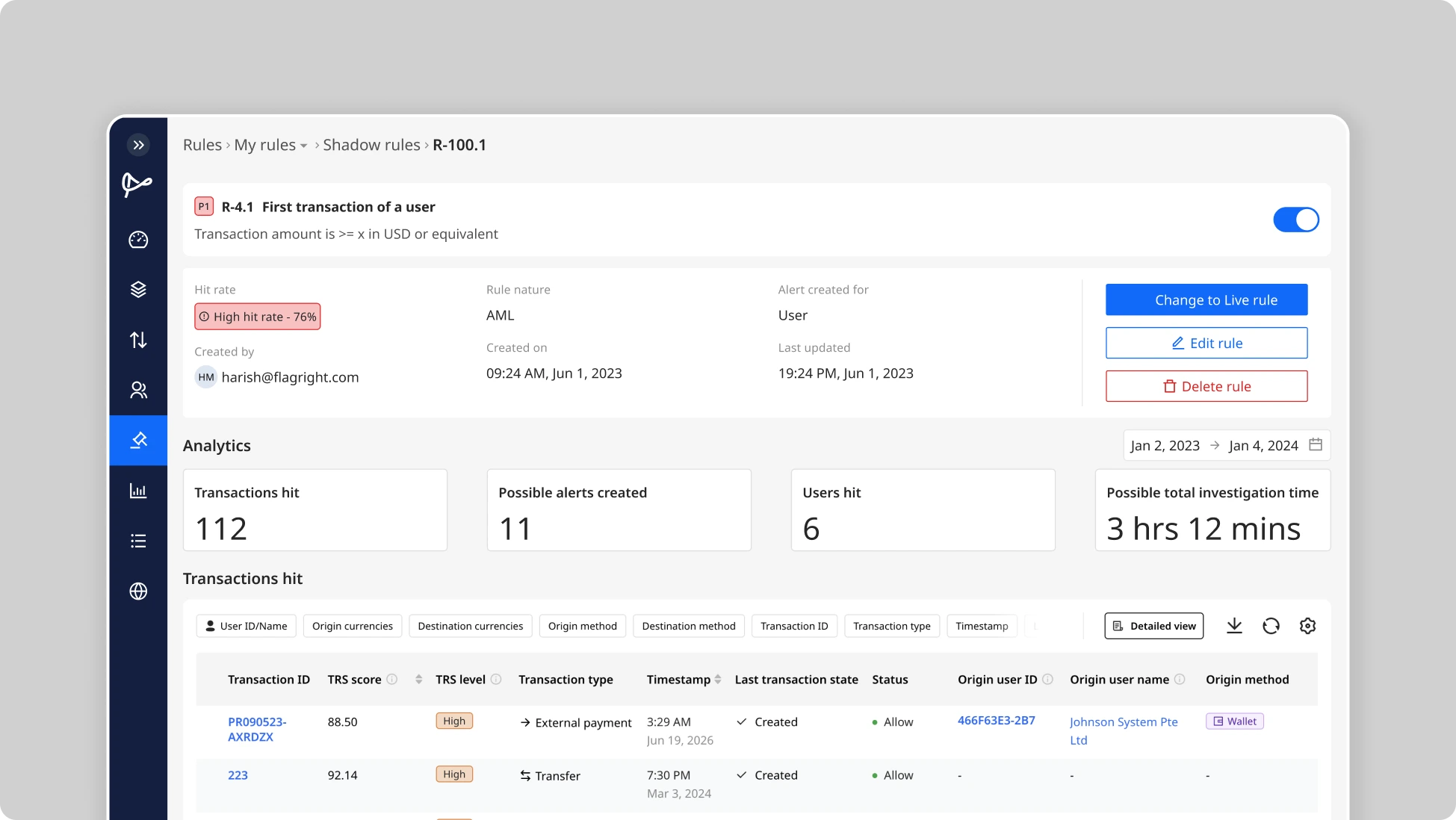 - What It Is: Rule Analytics is a comprehensive monitoring dashboard that provides full observability into each rule’s performance. Flagright tracks real-time and historical metrics for every rule, alert trigger frequency, affected users/transactions, false positive rate, and more, giving teams data-driven insight into how their controls are operating.