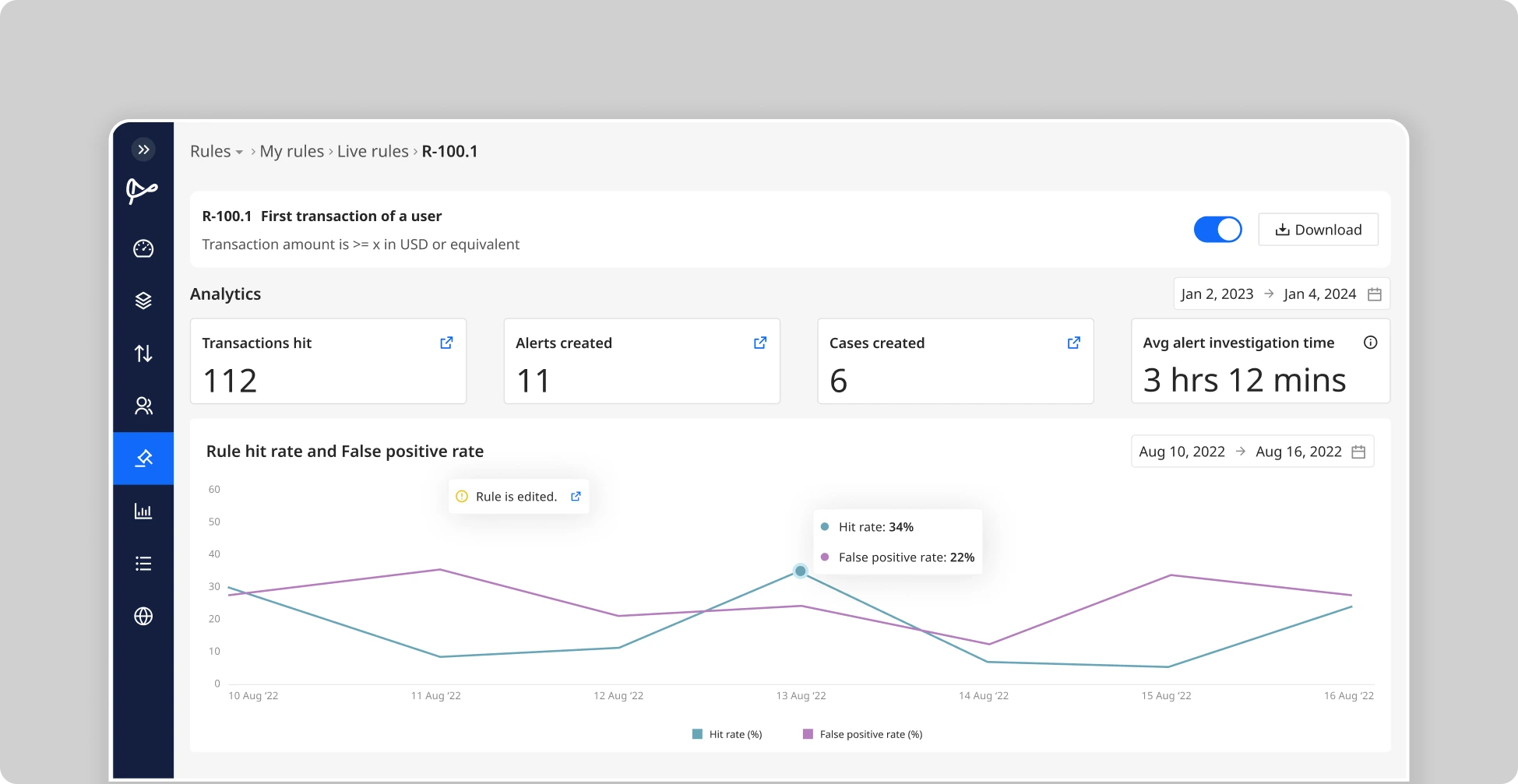 - How It Works: As alerts are generated and cases resolved, the platform aggregates outcomes per rule. For example, analysts can see that “Rule A triggered 100 alerts this week, of which 5% were true hits and 95% false alarms.” Key indicators like false positive ratios, average value of flagged transactions, conversion to cases or SARs, and trend lines over time are presented in a unified dashboard. The system also provides audit trails, every change to a rule’s logic or threshold is logged for compliance review, so you can trace why a rule behaved a certain way on a given day. Moreover, Flagright’s observability tools include real-time compliance performance charts and even notifications if certain rules spike in activity, enabling proactive management.