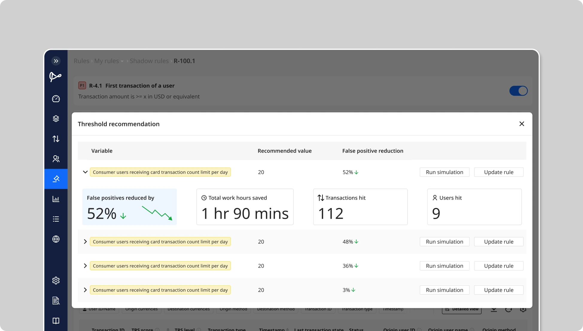 - Benefits in Practice: Compliance teams use simulations to fine-tune accuracy and reduce false positives prior to rollout. For example, if raising a threshold drops alert volume 50% with minimal impact to true hits, the team can confidently implement the change. Rule Simulation eliminates guesswork and lengthy trial-and-error in production. It accelerates tuning cycles (what once took weeks of monitoring now takes minutes) and prevents compliance blind spots by confirming that new rules actually catch the intended behavior.