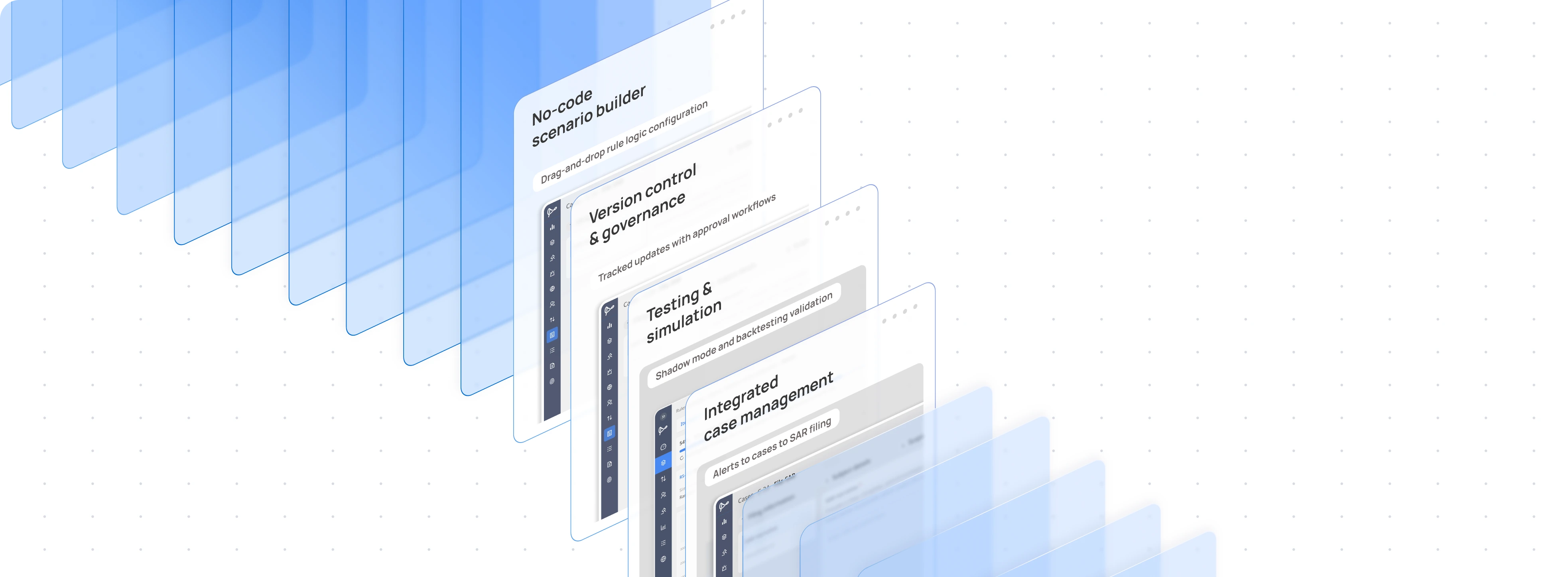 What makes a no-code AML platform so powerful for compliance teams? There are a few core features and capabilities that distinguish these solutions from the legacy approach. Below, we highlight the most important no-code capabilities, and how they directly address the challenges discussed earlier.
